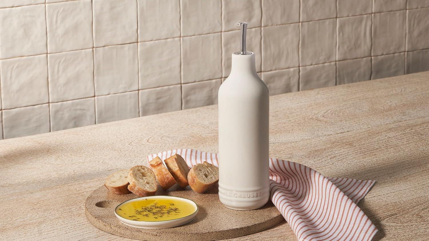 From prepping to serving, the Signature Oil Cruet is an essential kitchen accessory. With a generous 20 oz. capacity, it’s ideal for storing and dispensing oils, vinegars and other liquids. Expertly crafted from premium stoneware, it shields oils from light and heat to preserve their quality. The stainless steel curved pour spout ensures an even, controlled pour, while the iconic Le Creuset 3-ring design adds timeless elegance. Finished with a durable, easy-to-clean glaze inside and out, this cruet is both beautiful and dishwasher-safe for effortless maintenance.