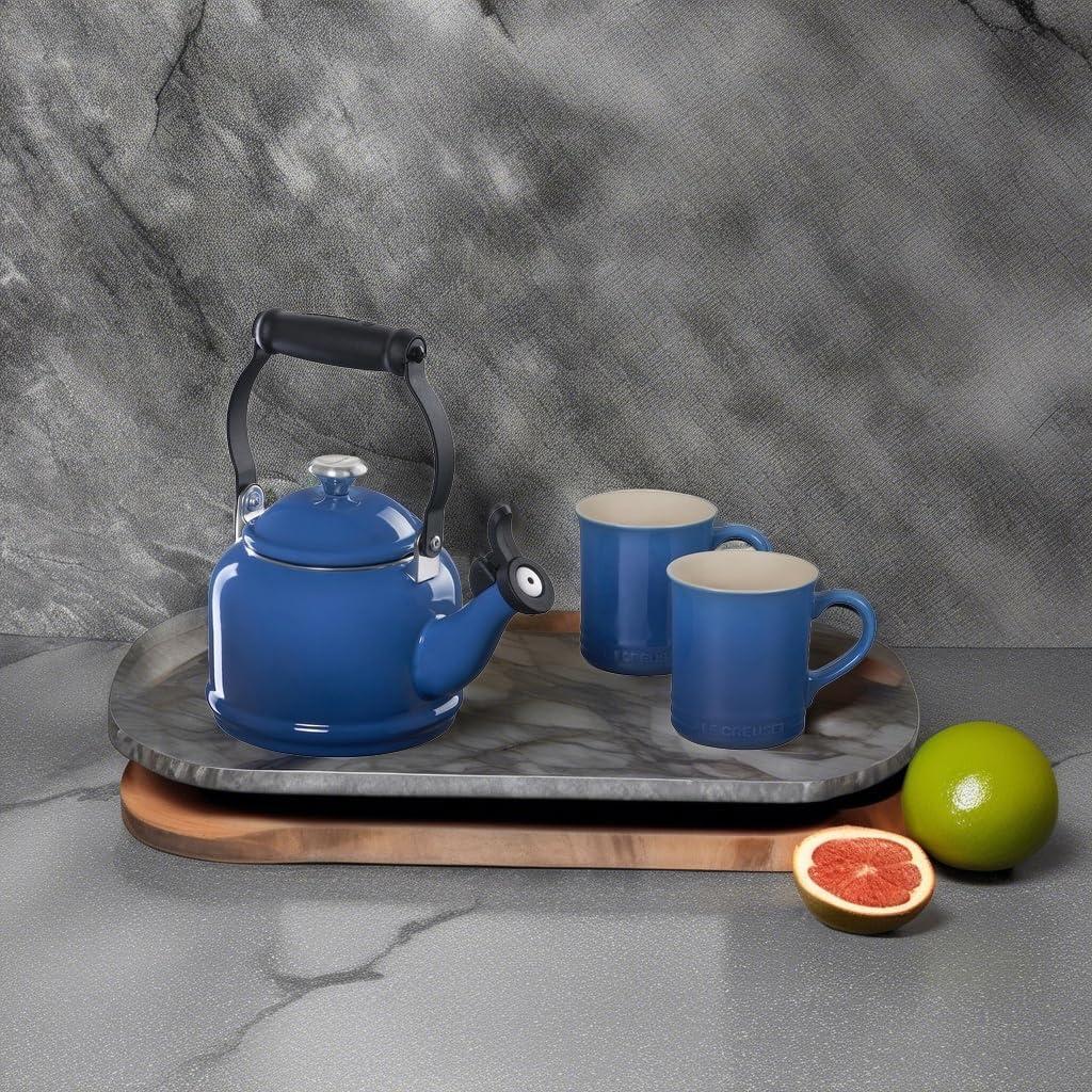 The Demi Kettle and Mug Set pairs our petite enamel on steel kettle with a charming set of matching stoneware mugs. The kettle is crafted from fast-heating premium carbon steel to rapidly bring water to a boil, and a fixed single-tone whistle alerts when the water is ready. Serve your favorite beverage in the perfectly color coordinated mugs – the generous 14-ounce capacity keeps contents warm or cold and is finished with a vibrant glaze which is easy to clean, dishwasher-safe, and resistant to chips, scratches and stains. The beautiful set makes an excellent gift for weddings, showers, parents, or any tea or coffee lover.