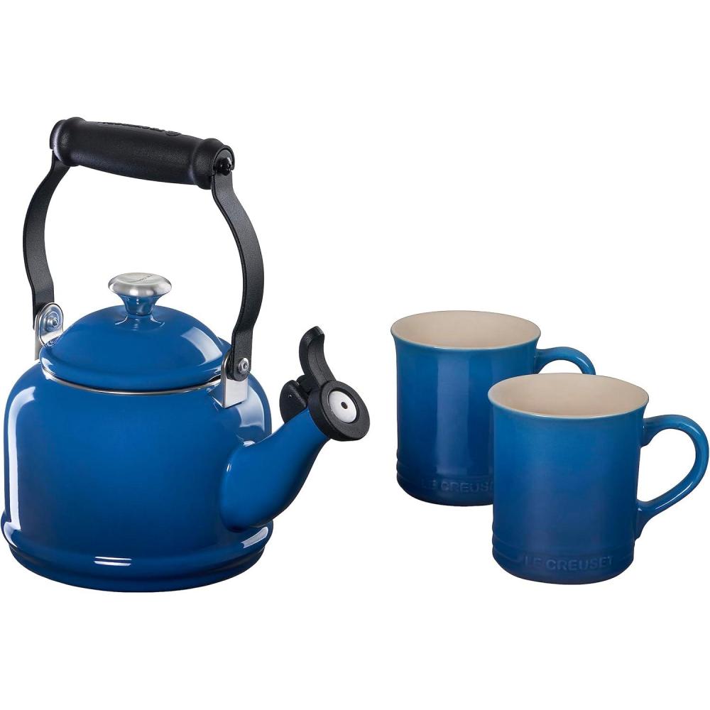 imageLe Creuset Enamel On Steel Demi Kettle with Metal Finishes ampamp Stoneware Set of 2 Mugs 125 qt Kettle ampamp 2 14 oz Mugs CeriseLicorice