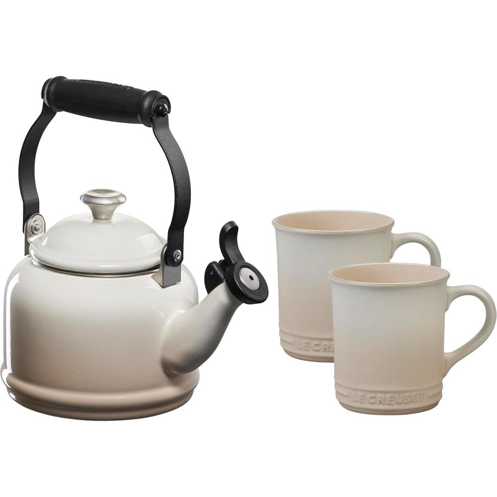 imageLe Creuset Enamel On Steel Demi Kettle with Metal Finishes ampamp Stoneware Set of 2 Mugs 125 qt Kettle ampamp 2 14 oz Mugs CeriseOyster