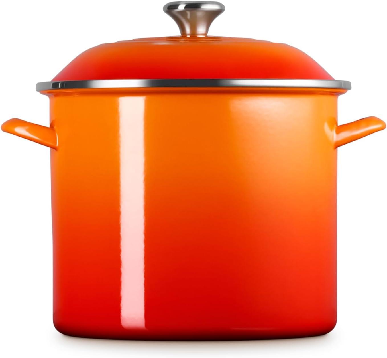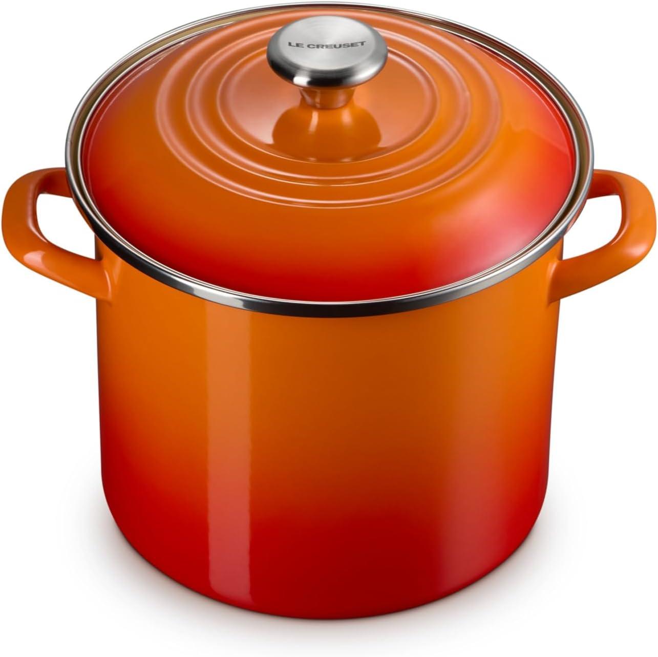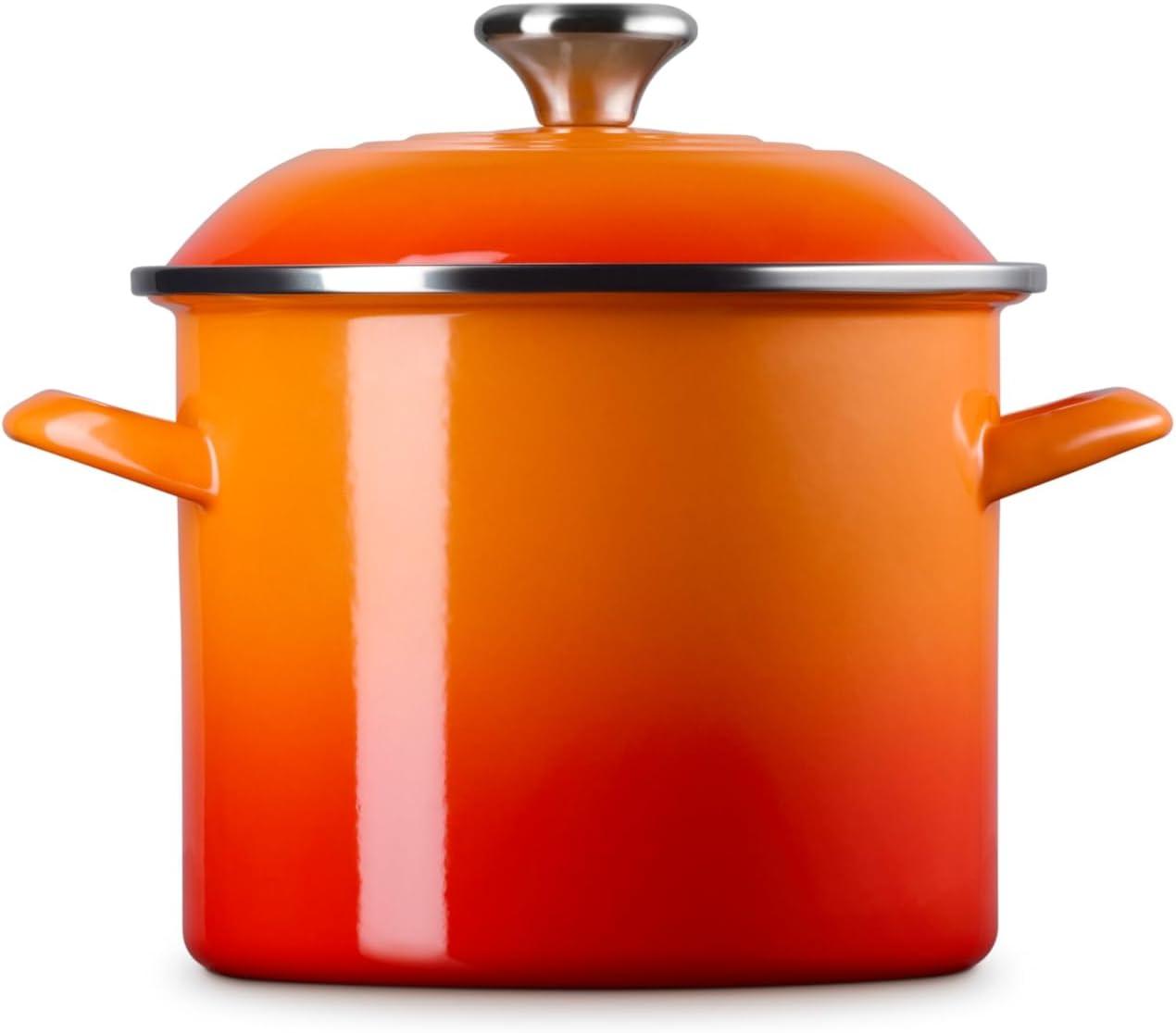Le Creuset enamel on steel stockpots and kettles deliver the fastest-heating performance of premium carbon steel glazed in our beautiful palette of colors. Lightweight and durable, carbon steel rapidly brings water to a boil to speed up prep and cooking and retains heat to keep food and liquids warm. The easy-to-clean colorful porcelain enamel coating is non-reactive and resistant to stains and flavors, making enamel on steel ideal for everyday use.